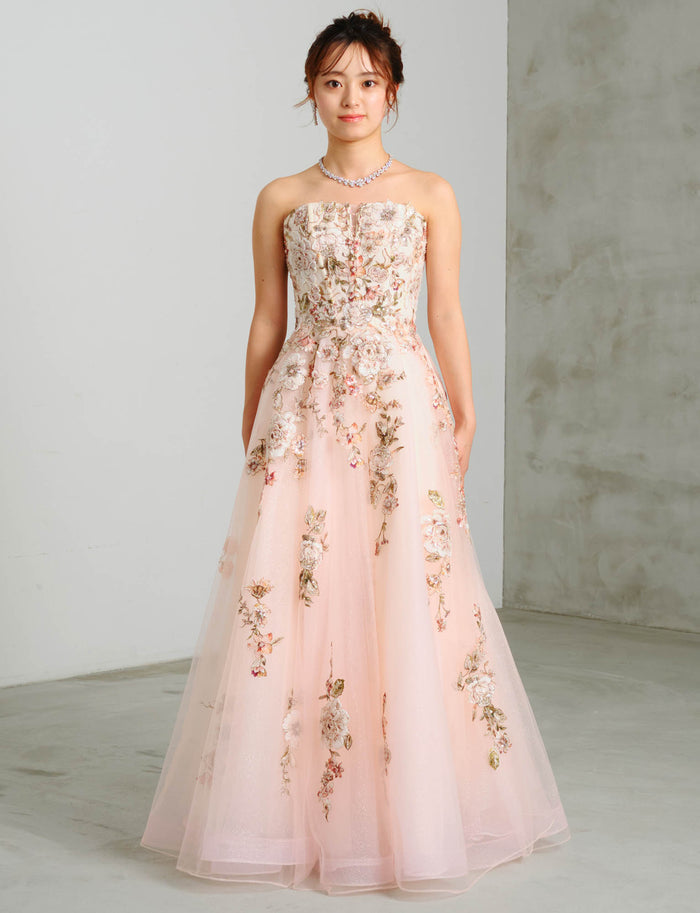 🎯人気ポイント:ドレス全体に散りばめられたお花モチーフが繊細で華やかな1着。