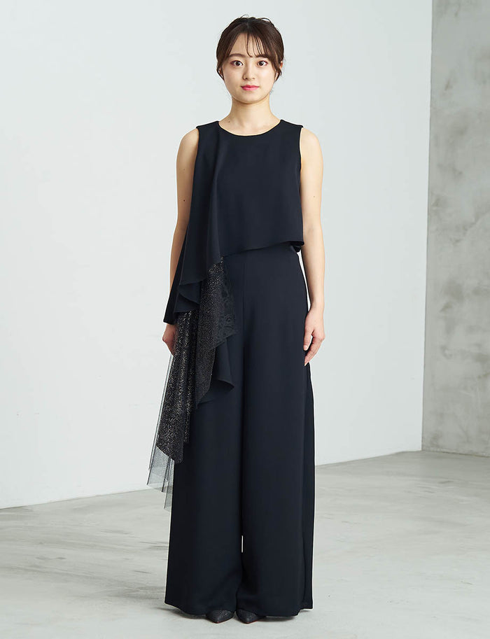 🎯人気ポイント:ドレープでウエストを美しく魅せる、ワンショルダー風デザインパンツドレス。